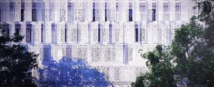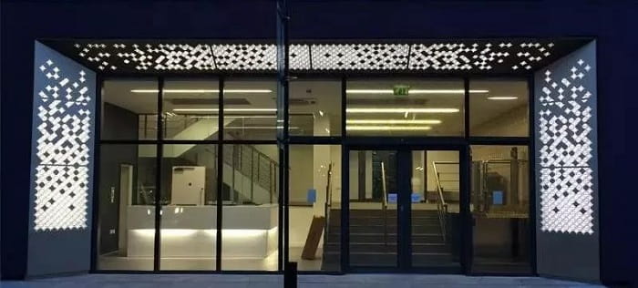 這些都是室外沖孔板的運用,結(jié)合rhino grasshopper的參數(shù)化處理,讓原本平平無奇的鋁單板美的淋漓盡致。同樣這樣的設(shè)計放在室內(nèi)也可以的,不論是展示墻的設(shè)計還是吊頂,外立面,這都會是一款讓設(shè)計師瘋狂的材料。