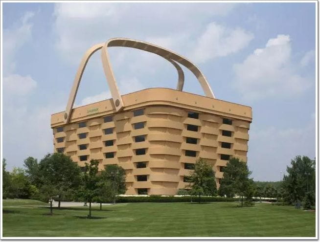 1997年,在美國(guó)俄亥俄州紐沃克市,一個(gè)“籃子”造型的大樓橫空出世,該大樓是由美國(guó)著名籃子制造商Longaberger建造的總部大樓。這座“籃子”大樓占地面積達(dá)25英畝,共7層樓,主體為鋼結(jié)構(gòu),2個(gè)籃子把手是根據(jù)公司的楓樹(shù)葉籃子復(fù)制而成,并由銅和木制的鉚釘連接,總重約150t。Longaberger公司最開(kāi)始僅僅是想仿建公司里銷售最好的一款楓樹(shù)葉籃子,但后來(lái)這座“籃子”大樓逐漸成為當(dāng)?shù)氐?a target="_blank" style="color:#151000;text-decoration:none;font-size:1em;font-family:微軟雅黑;border-bottom:1px dotted blue;">標(biāo)志性建筑,也成為“所建即所賣”建筑的典型。