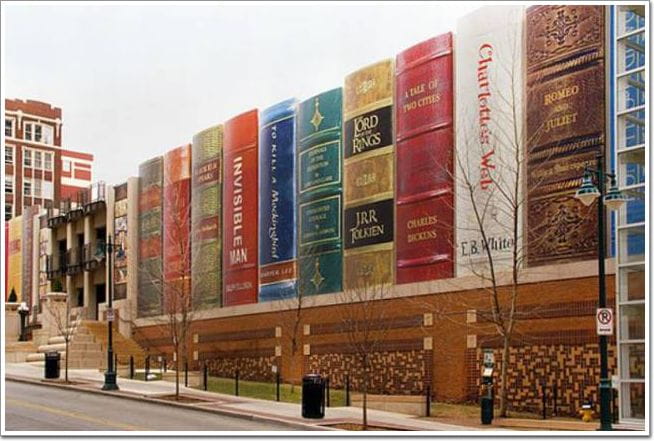 堪薩斯市公共圖書館(Kansas City Public Library)位于美國(guó)密蘇里州堪薩斯城,于1873年建成,但是它引人注目的原因并不是館中藏書豐富,而是停車場(chǎng)的獨(dú)特造型——“書架”?!皶堋鄙稀皵[放”著22本古典文學(xué)圖書,包括《指環(huán)王》《二十二條軍規(guī)》《夏洛特的網(wǎng)》等,全都是堪薩斯城居民推薦的圖書,其中書脊高7.6m,寬2.7m,立于墻面,兩本“書”之間用金屬樓梯井連接,模仿“書擋”,整個(gè)建筑猶如巨大的書架,體現(xiàn)了堪薩斯城居民對(duì)圖書的熱愛(ài),因此被譽(yù)為“美國(guó)最酷的圖書館”。