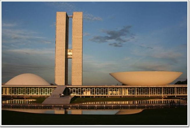 巴西議會(huì)大廈矗立于巴西首都巴西利亞市的核心三權(quán)廣場(chǎng)上,是由巴西建筑師奧斯卡·尼邁耶(Oscar Niemeyer)設(shè)計(jì),整幢大廈分為參議院、眾議院會(huì)議大廳和辦公樓3部分,由縱橫兩條軸線組成,水平、垂直的體形對(duì)比強(qiáng)烈。參議院、眾議院會(huì)議大廳的外形均是半球體,一仰一覆放置,猶如兩只巨大的“碗”;而中間的辦公大樓則是由兩座細(xì)長(zhǎng)的高樓連接而成,猶如一雙“筷子”,整座建筑相互協(xié)調(diào),巧妙地組合在一起,看上去就像一組“組合餐具”,引人入勝。