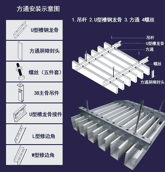 (1)購(gòu)買(mǎi)的鋁方通和與之配套的構(gòu)架、配件應(yīng)符合產(chǎn)品質(zhì)量要求,不得有彎曲變形。