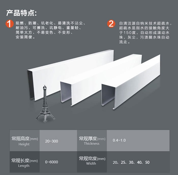 幕墻外墻、天花吊頂、造型鋁合金方通專(zhuān)業(yè)生產(chǎn)廠家首選廣州歐霸建材鋁業(yè),廣州歐霸天花是專(zhuān)業(yè)從事“鋁方通等建筑裝飾材料”研發(fā),生產(chǎn),銷(xiāo)售,安裝及技術(shù)服務(wù)于一體的現(xiàn)代型企業(yè)。鋁方通是最近幾年出現(xiàn)的新型裝飾材料,它具有輕質(zhì)、耐水、不吸塵、抗腐蝕、易擦洗、易安裝、立體感強(qiáng)、色彩柔和和美觀大方等特點(diǎn),深受用戶(hù)的歡迎。鋁方通是采用優(yōu)質(zhì)鋁合金板材為基材,再經(jīng)過(guò)數(shù)控折彎等技術(shù)成型,表面噴涂裝飾性涂料的一種新型幕墻材料。鋁方通基材采用1100H24、1060H24、3003H24、5005H24等幕墻專(zhuān)用單層鋁合金板。