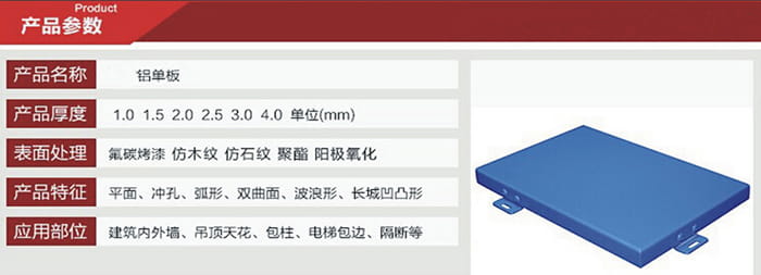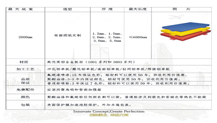 產(chǎn)品厚度: 厚度有1.2mm、1.5mm、2.0mm、2.5mm、3.0mm、4.0mm等各種規(guī)格,成型鋁單板最大尺寸可達(dá)1500x7000mm。
